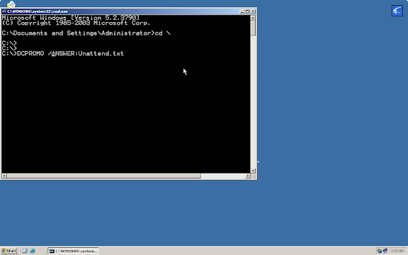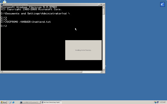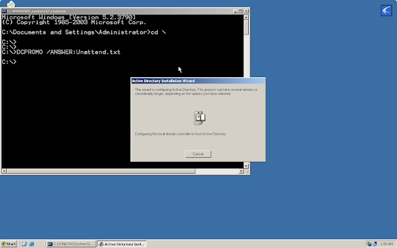 Để cài đặt Active Directory có 4 cách: -Sử dụng Active Directory Installation Wizard (thường được sử dụng) -Sử dụng answer file để cài đặt tự động -Sử dụng file backup hay backup media(thường dùng để nâng cấp Additional Domain Controller) -Sử dụng giao diện Configure Your Server Wizard Bài viết này tôi xin trình bày cách tạo answer file để cài đặt Active Directory tự động. Chuẩn bị: -PC cài hệ điều hành Window Server 2003 -Source Window Server 2003 (bài này sử dụng CD source) -Answer File: Unattend.txt -Mình nâng cấp DC nhatnghe.com Thực hiện: A)Tạo Answer File đặt tên Unattend.txt và chép vào ổ c:\ ![]() ![]() Chuẩn bị Source Win2K3,ở đây mình sử dụng CD Rom D:\ ![]() B)Nâng cấp DC Bước 1:Chỉnh Pre-DNS về DNS Server (ở đây mình sẽ để cài DNS tự động lên chính máy DC) ![]() Bước 2:Nâng cấp Start>Run>CMD Chuyển về thư mục gốc chứa file Unattend.txt ![]() > DCPROMO /answer:Unattent.txt ![]() ![]() ![]() ![]() ![]() ![]() ![]() ![]() *Kiểm tra: Start>Admin Tools> ![]() Active Directory Users and Computers ![]() DNS ![]() Bài viết có thiếu sót gì mong các thầy và các bạn cùng đóng góp Network for share Học Mạng cùng chia sẽ Theo: Trungbx (NhatNghe) ![]() |