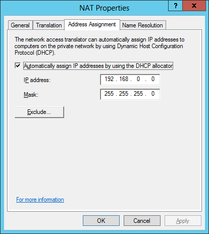 Usually you should be able to connect to the VMs from the host by connecting to eg. 192.168.137.2:3389. They won't have a ping though, so don't worry about that. Routing and Remote Access The same configuration can be acheived with RRAS on windows servers. This feature cannot be used together with ICS. Once you added this role in the server manager, open "mmc" and add the routing and remote access snap-in and add the local server. You can configure NAT by either selecting NAT directly in the wizard or by selecting custom configuration and just adding bare NAT, and then later adding interfaces yourself.